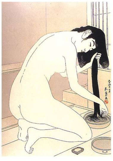 Wir bieten Ihnen eine handgefertigte Reproduktion auf Leinwand des berühmten Kunstwerks 'Frau, die ihr Haar' von Goyo Hashiguchi, aus dem Reproduktionsmuseum.