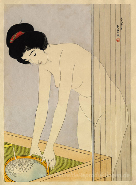 Wir bieten Ihnen eine handgefertigte Reproduktion auf Leinwand des berühmten Kunstwerks 'Frau waschen ihr Gesicht' von Goyo Hashiguchi, aus dem Reproduktionsmuseum.