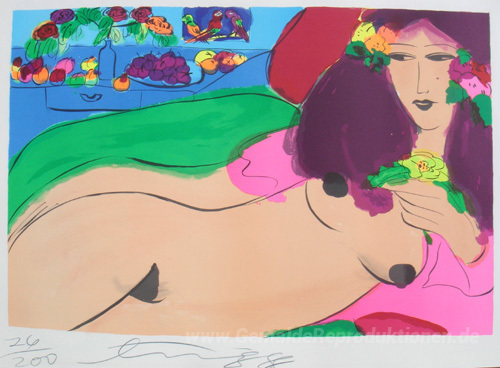 Wir bieten Ihnen eine handgefertigte Reproduktion auf Leinwand des berühmten Kunstwerks 'Frauen mit Blumen' von Walasse Ting, aus dem Reproduktionsmuseum.