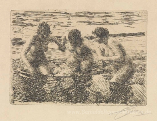 Wir bieten Ihnen eine handgefertigte Reproduktion auf Leinwand des berühmten Kunstwerks 'Gegen den Strom' von Anders Zorn, aus dem Reproduktionsmuseum.