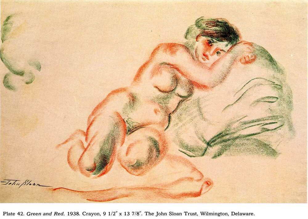 Wir bieten Ihnen eine handgefertigte Reproduktion auf Leinwand des berühmten Kunstwerks 'Grün und Rot' von John French Sloan, aus dem Reproduktionsmuseum.