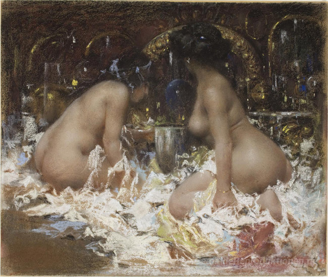 Wir bieten Ihnen eine handgefertigte Reproduktion auf Leinwand des berühmten Kunstwerks 'Im Boudoir' von Antonio Mancini, aus dem Reproduktionsmuseum.