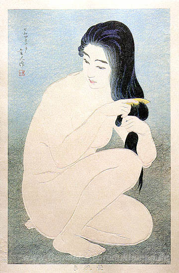 Wir bieten Ihnen eine handgefertigte Reproduktion auf Leinwand des berühmten Kunstwerks 'Kämmen in der Badewanne' von Torii Kotondo, aus dem Reproduktionsmuseum.