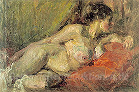 Wir bieten Ihnen eine handgefertigte Reproduktion auf Leinwand des berühmten Kunstwerks 'Ležeči akt' von Matej Sternen, aus dem Reproduktionsmuseum.
