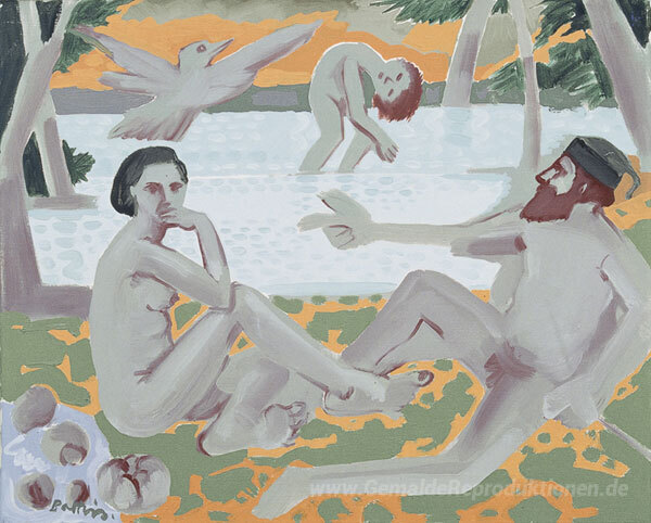 Wir bieten Ihnen eine handgefertigte Reproduktion auf Leinwand des berühmten Kunstwerks 'Le Déjeuner' von Walter Battiss, aus dem Reproduktionsmuseum.