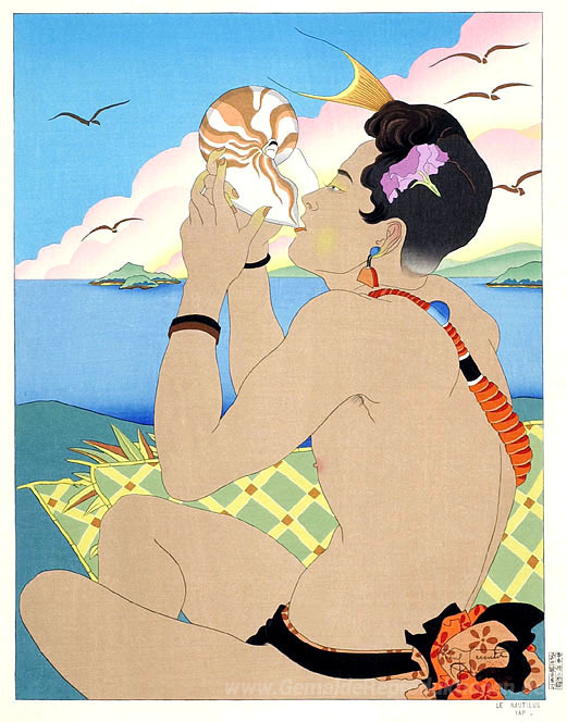 Wir bieten Ihnen eine handgefertigte Reproduktion auf Leinwand des berühmten Kunstwerks 'Le Nautilus. Kläffen' von Paul Jacoulet, aus dem Reproduktionsmuseum.
