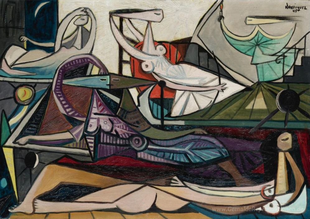Wir bieten Ihnen eine handgefertigte Reproduktion auf Leinwand des berühmten Kunstwerks 'Les Odalisques' von Oscar Dominguez, aus dem Reproduktionsmuseum.