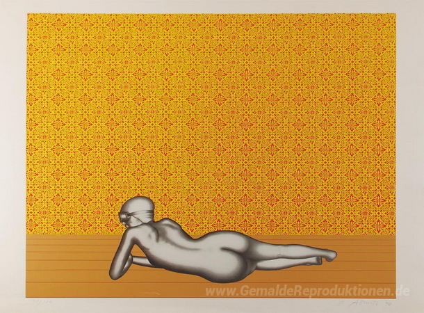 Wir bieten Ihnen eine handgefertigte Reproduktion auf Leinwand des berühmten Kunstwerks 'Liegende II vor Tapete' von Dieter Asmus, aus dem Reproduktionsmuseum.