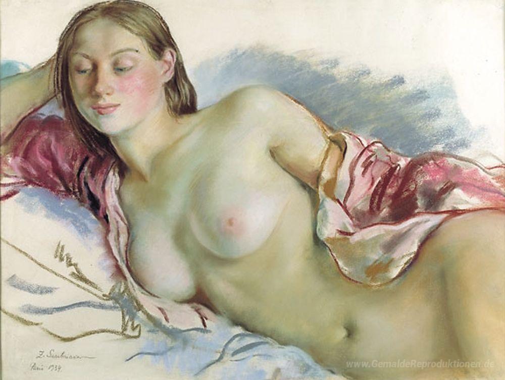 Wir bieten Ihnen eine handgefertigte Reproduktion auf Leinwand des berühmten Kunstwerks 'Liegender Akt mit Kirsch Mantel' von Zinaida Serebriakova, aus dem Reproduktionsmuseum.