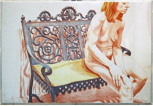 Wir bieten Ihnen eine handgefertigte Reproduktion auf Leinwand des berühmten Kunstwerks 'Mädchen auf Eisen-Bank' von Philip Pearlstein, aus dem Reproduktionsmuseum.