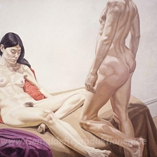 Wir bieten Ihnen eine handgefertigte Reproduktion auf Leinwand des berühmten Kunstwerks 'Männliche und weibliche Akt mit roten und purpurroten Drape' von Philip Pearlstein, aus dem Reproduktionsmuseum.