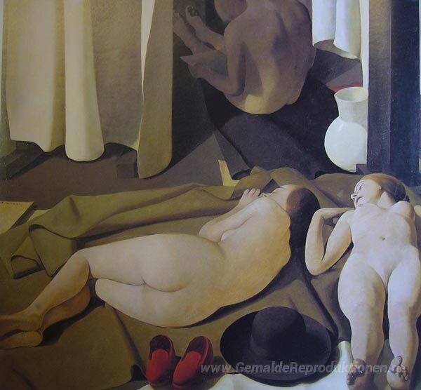 Wir bieten Ihnen eine handgefertigte Reproduktion auf Leinwand des berühmten Kunstwerks 'Meriggio' von Felice Casorati, aus dem Reproduktionsmuseum.