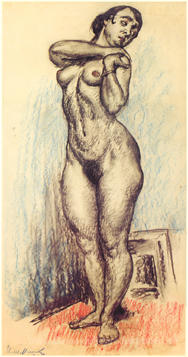 Wir bieten Ihnen eine handgefertigte Reproduktion auf Leinwand des berühmten Kunstwerks 'Nackt Stehen und legte ihre Hand auf ihrer linken Schulter' von Ilya Mashkov, aus dem Reproduktionsmuseum.