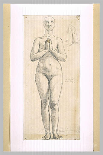 Wir bieten Ihnen eine handgefertigte Reproduktion auf Leinwand des berühmten Kunstwerks 'Nackte Frau, stehend, von vorne, die Hände vor der Brust verschr' von Jean Auguste Dominique Ingres, aus dem Reproduktionsmuseum.