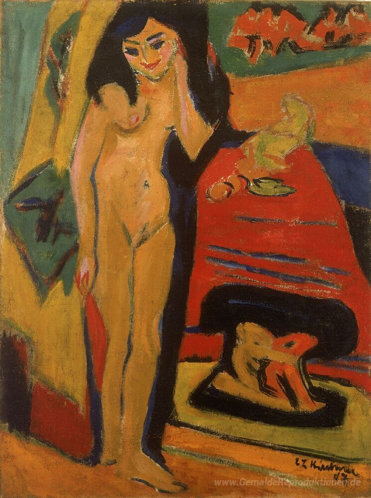 Wir bieten Ihnen eine handgefertigte Reproduktion auf Leinwand des berühmten Kunstwerks 'Nacktes Mädchen hinter dem Vorhang (Franzi)' von Ernst Ludwig Kirchner, aus dem Reproduktionsmuseum.