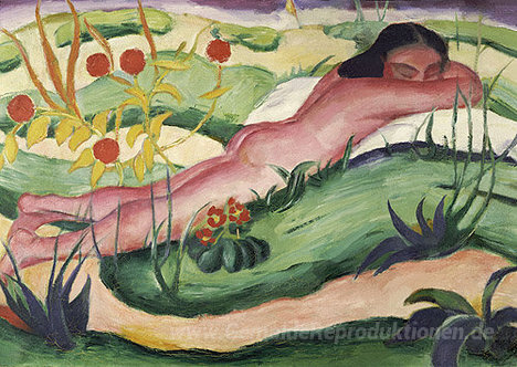 Wir bieten Ihnen eine handgefertigte Reproduktion auf Leinwand des berühmten Kunstwerks 'Nude liegen in den Blumen' von Franz Marc, aus dem Reproduktionsmuseum.