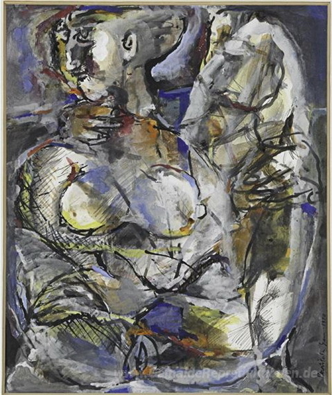 Wir bieten Ihnen eine handgefertigte Reproduktion auf Leinwand des berühmten Kunstwerks 'Ohne Titel' von Paritosh Sen, aus dem Reproduktionsmuseum.