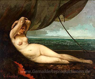 Wir bieten Ihnen eine handgefertigte Reproduktion auf Leinwand des berühmten Kunstwerks 'Reclining Nude by the Sea' von Gustave Courbet, aus dem Reproduktionsmuseum.