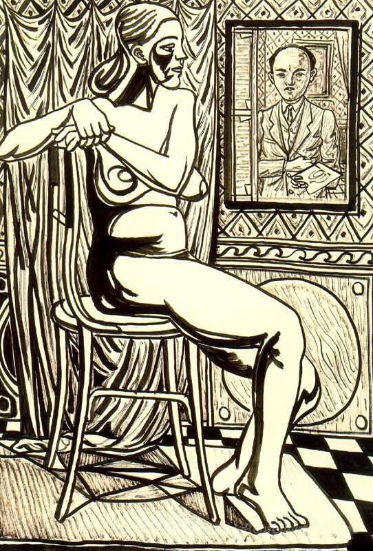 Wir bieten Ihnen eine handgefertigte Reproduktion auf Leinwand des berühmten Kunstwerks 'Sitzender weiblicher Akt und Künstlerselbstporträt' von Rafael Zabaleta, aus dem Reproduktionsmuseum.