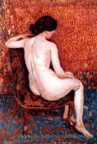 Wir bieten Ihnen eine handgefertigte Reproduktion auf Leinwand des berühmten Kunstwerks 'Sitzt nackt auf dem Stuhl' von Georges Lemmen, aus dem Reproduktionsmuseum.