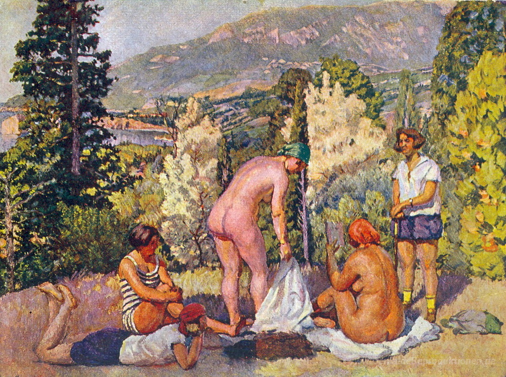Wir bieten Ihnen eine handgefertigte Reproduktion auf Leinwand des berühmten Kunstwerks 'Sonnenbaden auf der Krim' von Ilya Mashkov, aus dem Reproduktionsmuseum.