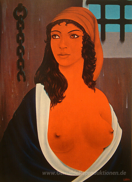 Wir bieten Ihnen eine handgefertigte Reproduktion auf Leinwand des berühmten Kunstwerks 'Theroigne de Mericourt' von Felix Labisse, aus dem Reproduktionsmuseum.