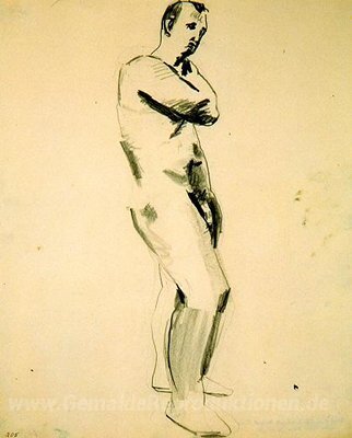 Wir bieten Ihnen eine handgefertigte Reproduktion auf Leinwand des berühmten Kunstwerks 'Untitled (Nude Male Abbildung)' von David Park, aus dem Reproduktionsmuseum.