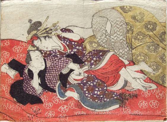 Wir bieten Ihnen eine handgefertigte Reproduktion auf Leinwand des berühmten Kunstwerks 'Vorspiel auf einem Red Futon' von Utagawa Kunisada, aus dem Reproduktionsmuseum.
