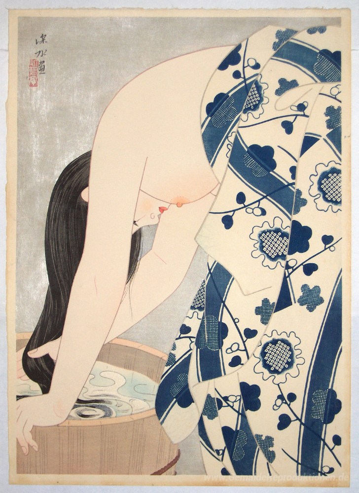 Wir bieten Ihnen eine handgefertigte Reproduktion auf Leinwand des berühmten Kunstwerks 'Waschen der Haare' von Ito Shinsui, aus dem Reproduktionsmuseum.