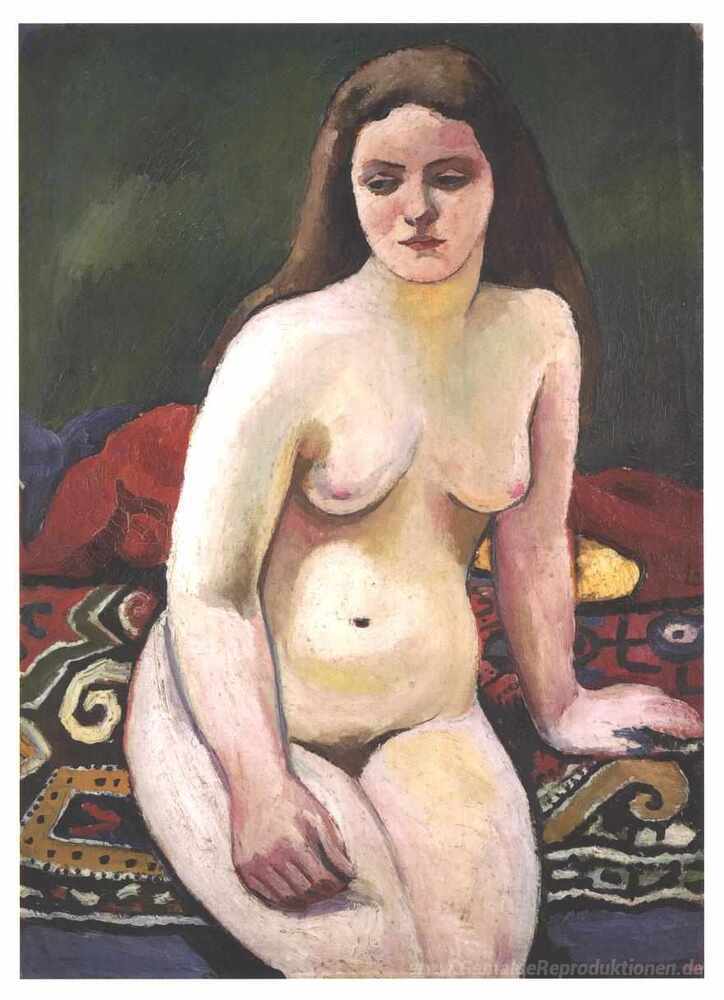 Wir bieten Ihnen eine handgefertigte Reproduktion auf Leinwand des berühmten Kunstwerks 'Weiblicher Akt in einem knited Teppich' von August Macke, aus dem Reproduktionsmuseum.