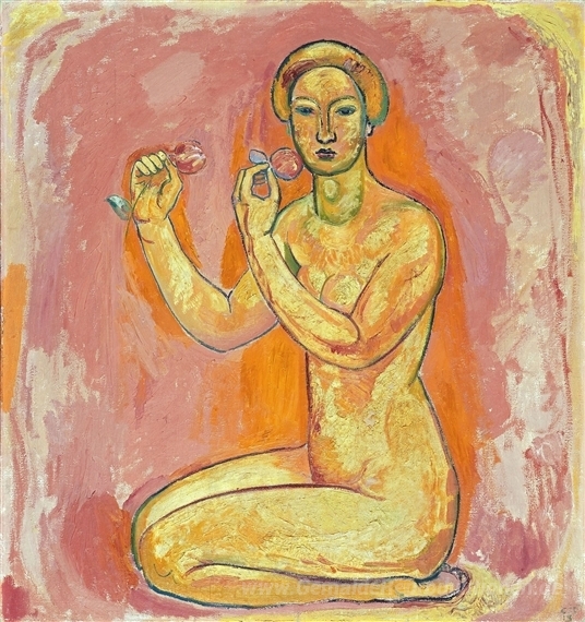 Wir bieten Ihnen eine handgefertigte Reproduktion auf Leinwand des berühmten Kunstwerks 'Weiblicher Akt mit Blumen (Die Wahrheit)' von Cuno Amiet, aus dem Reproduktionsmuseum.