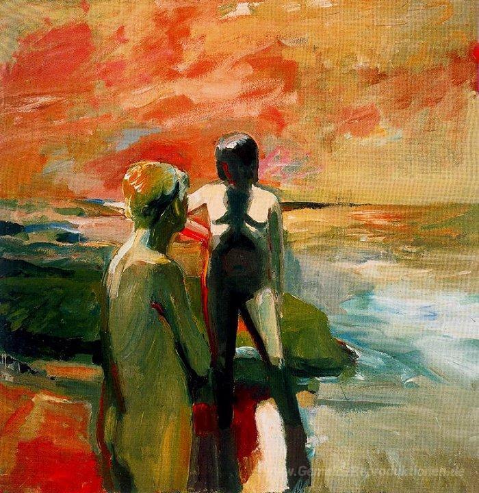 Wir bieten Ihnen eine handgefertigte Reproduktion auf Leinwand des berühmten Kunstwerks 'Zwei Zahlen an der Küste' von Elmer Bischoff, aus dem Reproduktionsmuseum.