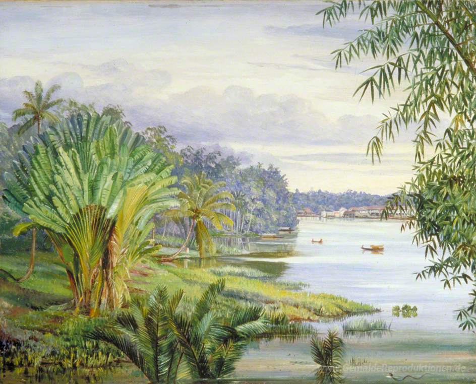 Wir bieten Ihnen eine handgefertigte Reproduktion auf Leinwand des berühmten Kunstwerks 'Ansicht von Kuching und Fluss, Sarawak, Borneo' von Marianne North, aus dem Reproduktionsmuseum.