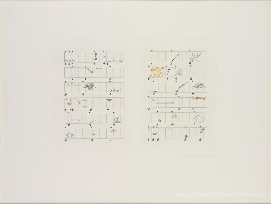 Wir bieten Ihnen eine handgefertigte Reproduktion auf Leinwand des berühmten Kunstwerks 'Score Ohne Parts (40 Drawings by Thoreau) / Zwölf Haiku' von John Cage, aus dem Reproduktionsmuseum.