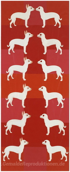 Wir bieten Ihnen eine handgefertigte Reproduktion auf Leinwand des berühmten Kunstwerks 'Chichi trifft den Tod der Malerei' von Philip Taaffe, aus dem Reproduktionsmuseum.