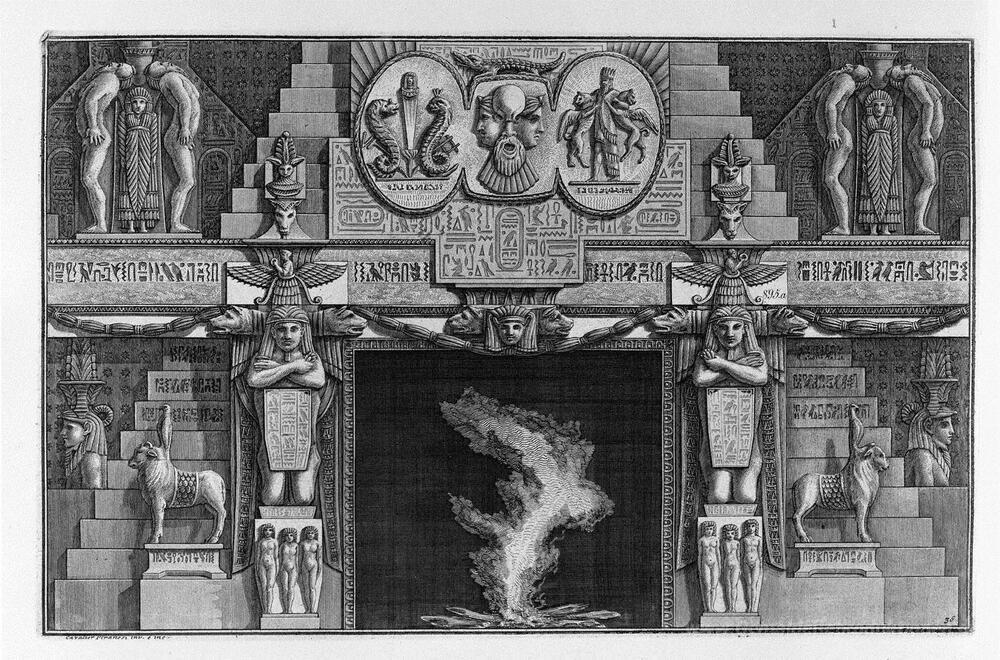 Wir bieten Ihnen eine handgefertigte Reproduktion auf Leinwand des berühmten Kunstwerks 'Ägyptischen Stil Kamin, die von zwei knienden weiblichen Figuren' von Giovanni Battista Piranesi, aus dem Reproduktionsmuseum.
