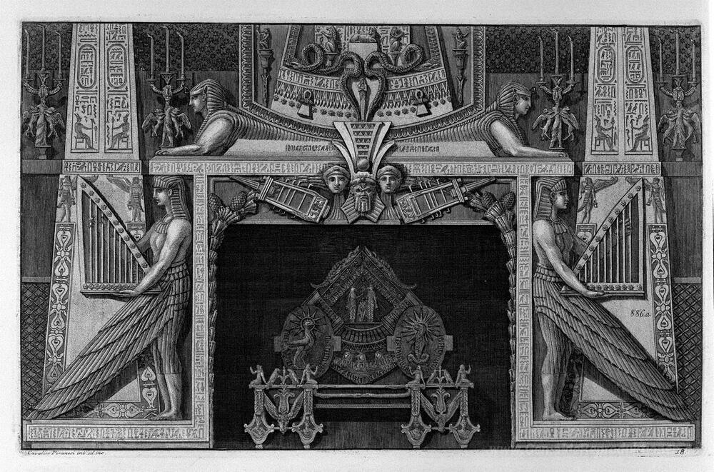 Wir bieten Ihnen eine handgefertigte Reproduktion auf Leinwand des berühmten Kunstwerks 'Ägyptischen Stil Kamin von zwei Sphinxen überragt und von zwei g' von Giovanni Battista Piranesi, aus dem Reproduktionsmuseum.