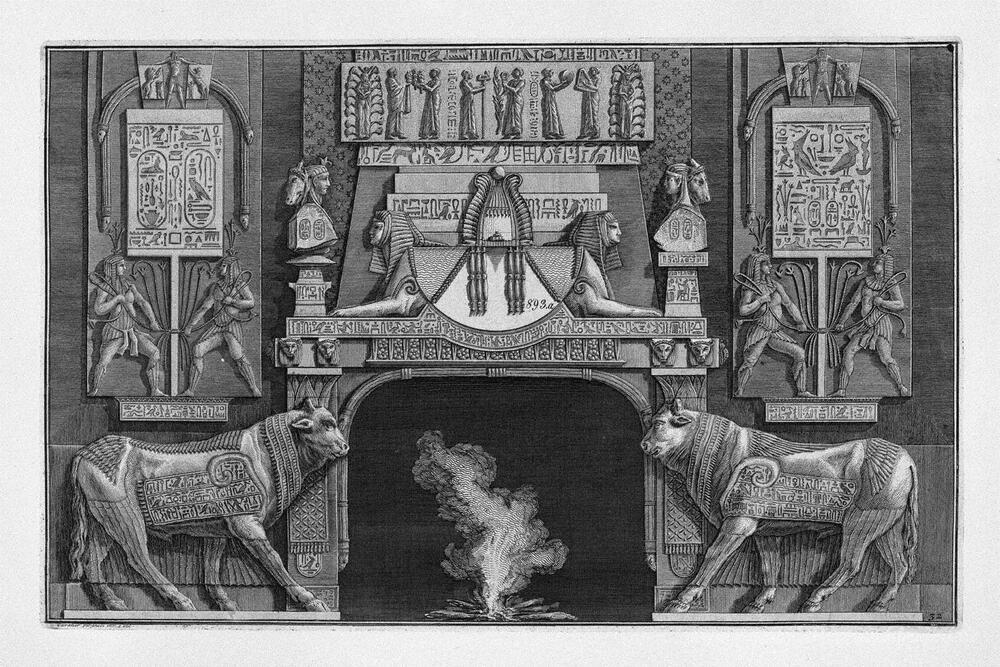 Wir bieten Ihnen eine handgefertigte Reproduktion auf Leinwand des berühmten Kunstwerks 'Kamin im ägyptischen Stil, auf jeder Seite eine heilige Kuh im P' von Giovanni Battista Piranesi, aus dem Reproduktionsmuseum.