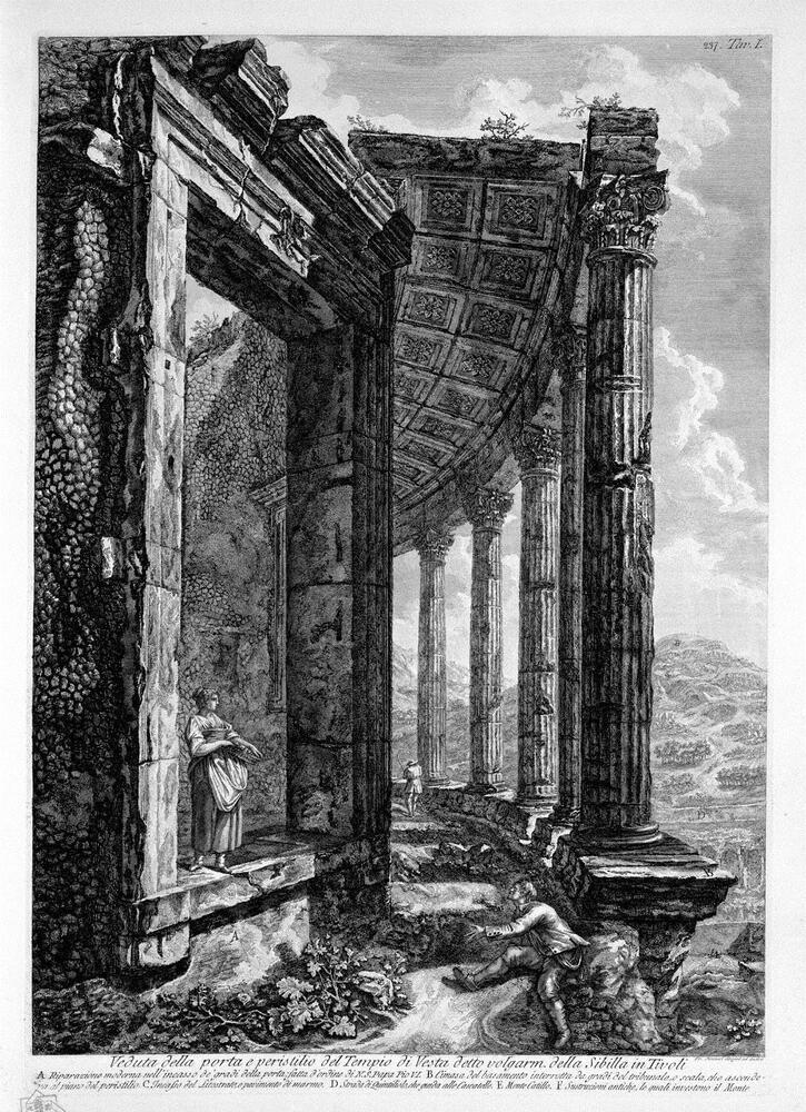 Willkommen in unserer sorgfältig kuratierten Kollektion handverlesener Ölgemälde, die nicht nur exquisite Kunstwerke, sondern auch einen Hauch von Eleganz in Ihr Zuhause bringen. Jedes Gemälde erzählt eine eigene Geschichte, und das Werk Mit Blick auf das Peristyl und die Tür der Tempel der Vesta von Giovanni Battista Piranesi ist da keine Ausnahme. Piranesi, ein Meister der italienischen Vedutenmalerei des 18. Jahrhunderts, fängt mit seinem unverwechselbaren Stil die zeitlose Schönheit antiker Architektur ein.