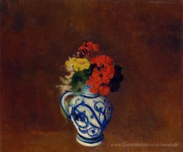 Geranien und andere Blumen in einer Vase aus Steinzeug