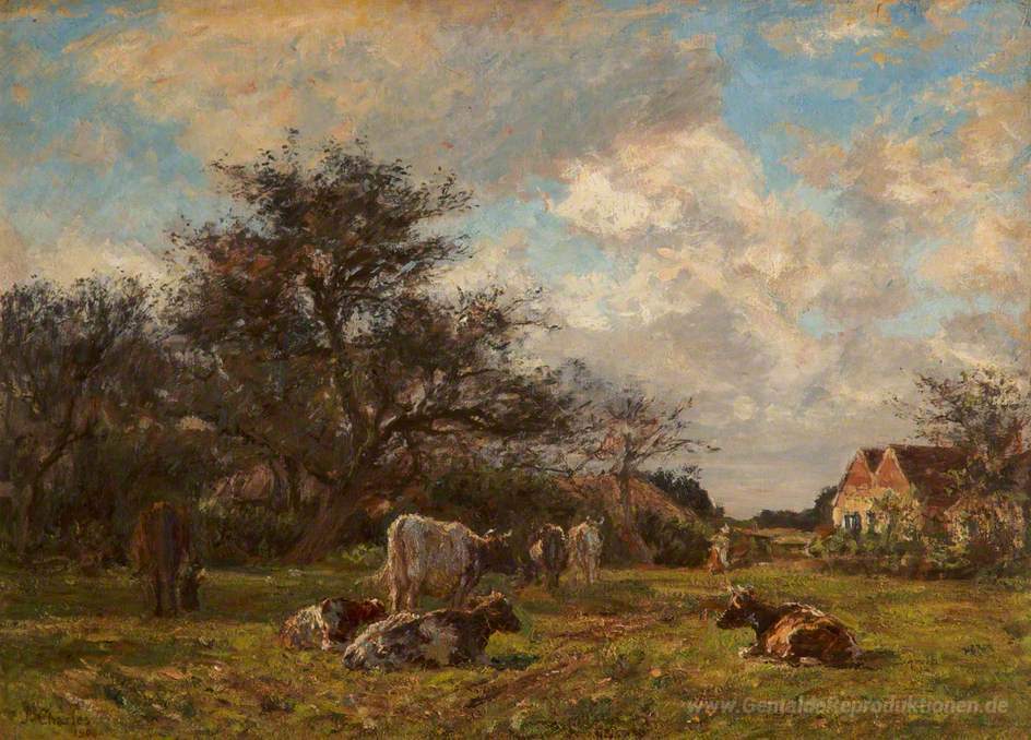 Wir bieten Ihnen eine handgefertigte Reproduktion auf Leinwand des berühmten Kunstwerks 'Auf einem Bauernhof in Sussex' von James Charles, aus dem Reproduktionsmuseum.