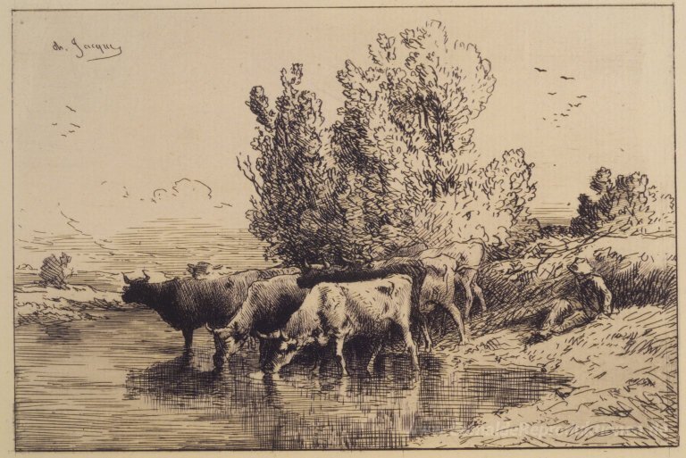 Wir bieten Ihnen eine handgefertigte Reproduktion auf Leinwand des berühmten Kunstwerks 'Cows' von Charles Jacque, aus dem Reproduktionsmuseum.