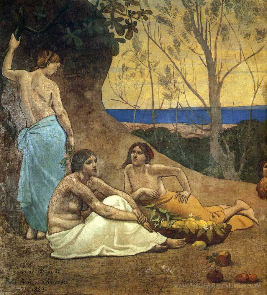 Willkommen in der faszinierenden Welt der Ölgemälde, die nicht nur als dekorative Elemente dienen, sondern auch Emotionen wecken und Geschichten erzählen. Eines dieser Meisterwerke ist Das Happy Land (Detail), geschaffen von dem virtuosen Künstler Pierre Puvis de Chavannes. Bekannt für seinen einzigartigen Stil, vereint Puvis de Chavannes klassische und symbolistische Ansätze, die den Betrachter in eine harmonische und friedliche Atmosphäre entführen.