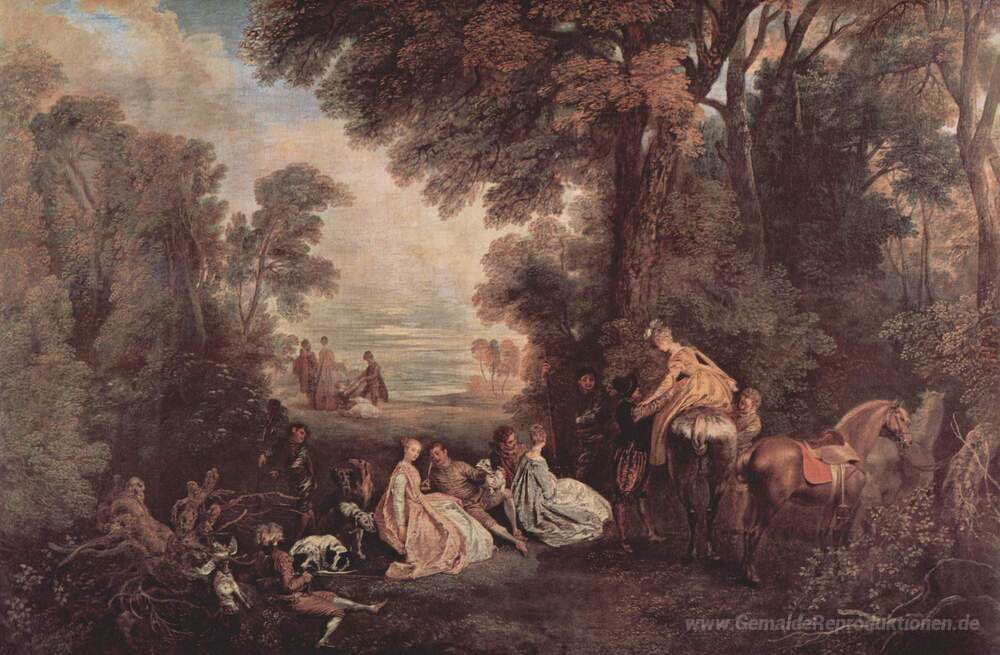 Wir bieten Ihnen eine handgefertigte Reproduktion auf Leinwand des berühmten Kunstwerks 'Der Halt während der Chase' von Antoine Watteau, aus dem Reproduktionsmuseum.