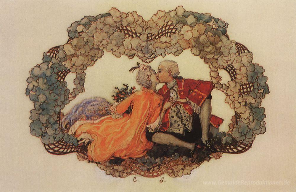 Wir bieten Ihnen eine handgefertigte Reproduktion auf Leinwand des berühmten Kunstwerks 'Der Kuss' von Konstantin Somov, aus dem Reproduktionsmuseum.