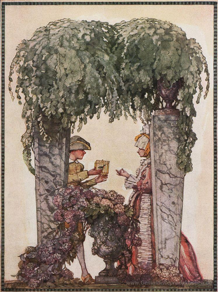 Wir bieten Ihnen eine handgefertigte Reproduktion auf Leinwand des berühmten Kunstwerks 'Gardener Gift' von Konstantin Somov, aus dem Reproduktionsmuseum.