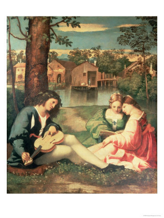 Wir bieten Ihnen eine handgefertigte Reproduktion auf Leinwand des berühmten Kunstwerks 'Jugend mit einer Gitarre und zwei Mädchen auf einer Flussbank si' von Giorgione, aus dem Reproduktionsmuseum.