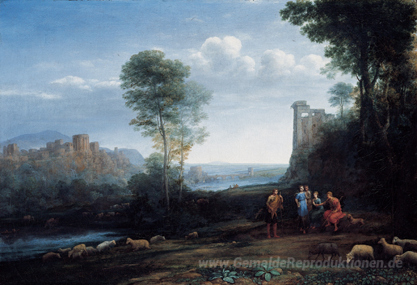 Wir bieten Ihnen eine handgefertigte Reproduktion auf Leinwand des berühmten Kunstwerks 'Pastorale Landschaft' von Claude Lorrain, aus dem Reproduktionsmuseum.