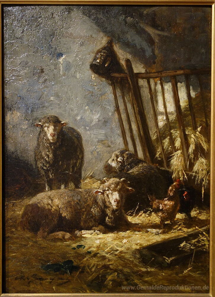 Wir bieten Ihnen eine handgefertigte Reproduktion auf Leinwand des berühmten Kunstwerks 'Sheep in Manger' von Charles Jacque, aus dem Reproduktionsmuseum.