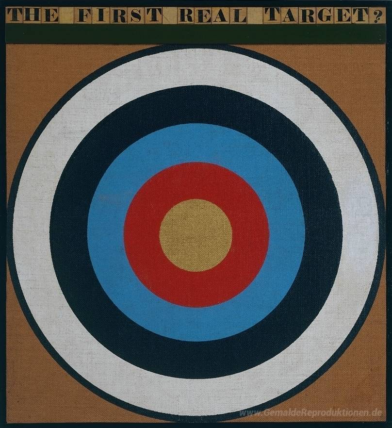 Wir bieten Ihnen eine handgefertigte Reproduktion auf Leinwand des berühmten Kunstwerks 'Die erste wirkliche Ziel?' von Peter Blake, aus dem Reproduktionsmuseum.